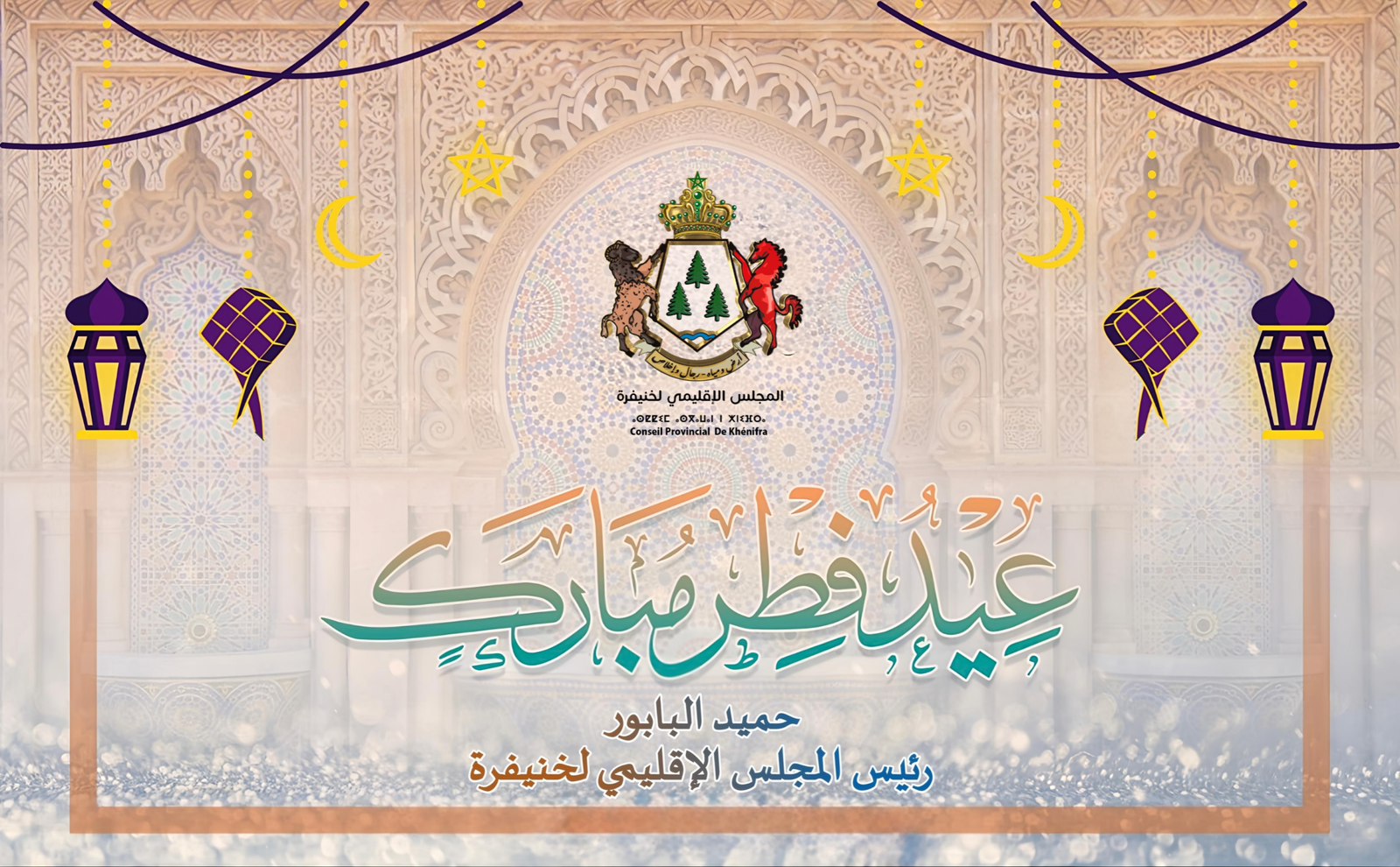 بمناسبة حلول عيد الفطر المبارك السعيد لعام 1447 هجرية ، وفي غمرة الخشوع والإيمان ، وإنتهاء شهر العبادة والقرأن ، ومع الفرحة التي تعيشها ساكنة إقليم خنيفرة بهذه المناسبة السعيدة، يتشرف السيد حميد البابور رئيس المجلس الإقليمي لخنيفرة، اصالة عن نفسه و نيابة عن كافة اعضاء وأطر موظفي و مستخدمي المجلس الإقليمي بتقديم أحر التهاني والتبريكات لأمير المؤمنين صاحب الجلالة الملك محمد السادس نصره الله وأيده، ولكافة أفراد العائلة الملكية الشريفة، ولساكنة إقليم خنيفرة ، وللشعب المغربي وعموم الأمة العربية والإسلامية، راجيا من العلي القدير أن يتقبل منا ومنكم صالح الأعمال، ويُعيد هذا العيد علينا بموفور الصحة والسعادة والهناء وعلى بلدنا بمزيد من التطور والرقيّ والأمن والاستقرار.
